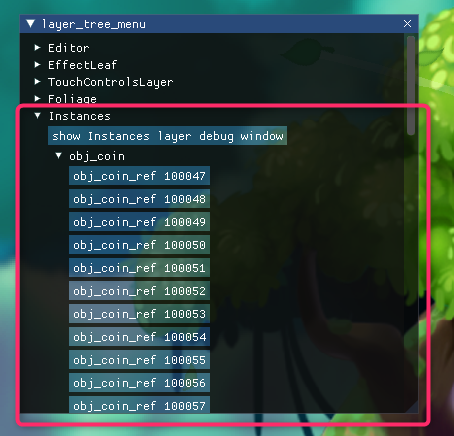インスタンスレイヤーの場合はオブジェクトインスタンスが、アセットレイヤーならスプライトが一覧されます。