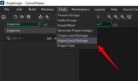 GMS2を起動して「ツール」「ローカルパッケージをインポート」を選択します。